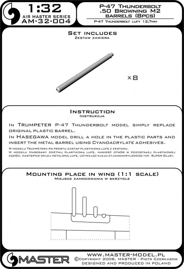 In Trumpeter P-47 Thunderbolt model simply replace original plastic barrel. In Hasegawa model drill a hole in the plastic parts and insert the metal barrel using Cyanoacrylate adhesives.