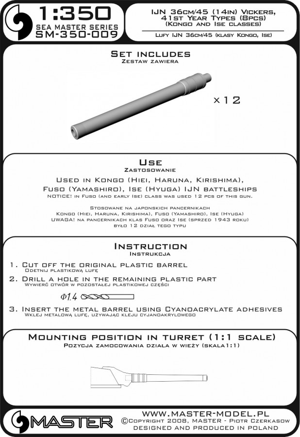 It is very simple to use in Your model, and makes it extremely realistic. Simply cut off the original plastic barrel and drill a hole in the remaining blastbag and insert the metal barrel using Cyanoacrylate adhesives. Used in Kongo (Hiei, Haruna, Kirishima), Fuso (Yamashiro), Ise (Hyuga) IJN battleships.
